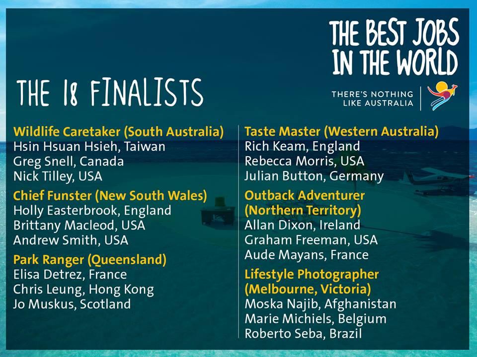 With that being said, out of the 600,000 applications and the 45,000 video submissions worldwide – the 150 original shortlisted finalists has been narrowed down to only 18 finalists! The top 3 out of the 25 who campaigns for each of the 6 jobs will be making their way down to Australia via Virgin Airways for June 12th 2013! They will be put to the ultimate test, going through various in-person interviews, and adventures to test if they are the BEST person for the job. It’s going to be quite the race to the finish line and I can’t wait to see how far the top 18 will go to get the job!