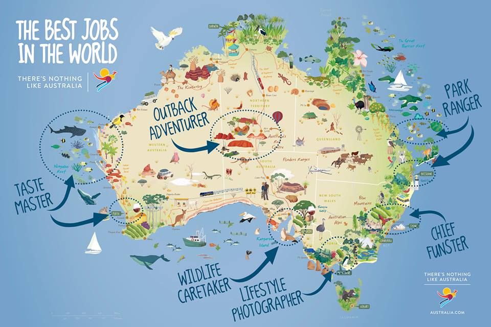 The most sought-after job has been NSW’s Chief Funster (20.2 per cent), closely followed by South Australia’s Wildlife Caretaker (19.9 per cent), Queensland’s Park Ranger (17.5 per cent), Western Australia’s Taste Master (14.7 per cent), Northern Territory’s Outback Adventurer (14.3 per cent) and Victoria’s Lifestyle Photographer (13.4 per cent).